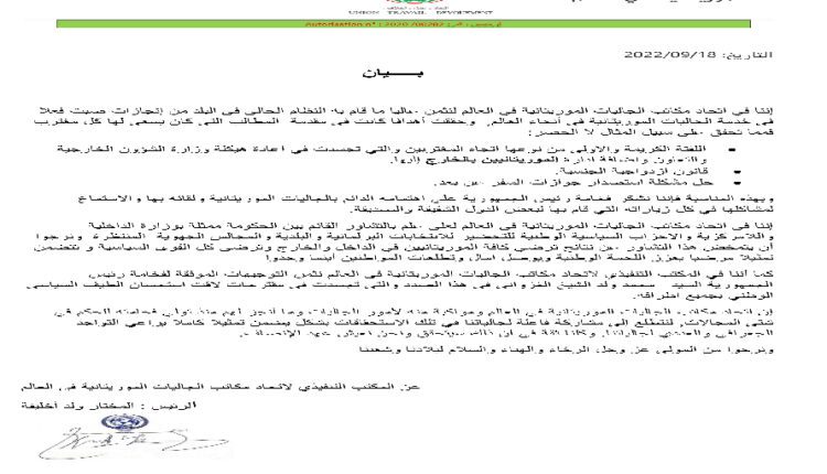 كما أننا في المكتب التنفيذي لاتحاد مكاتب الجاليات الموريتانية فى العالم، نثمن التوجيهات الموفقة لفخامة رئيس الجمهورية السيد: محمد ولد الشيخ الغزواني في هذا الصدد والتي تجسدت في مقترحات لاقت استحسان الطيف السياسي الوطني بجميع اطرافه.