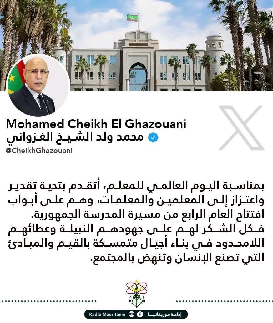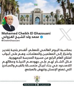 الرئيسية/الأخبار// بمناسبة اليوم العالمي للمعلم رئيس الجمهورية يهنئ المعلمين الموريتانيين الأخبار / بمناسبة اليوم العالمي للمعلم رئيس الجمهورية يهنئ المعلمين الموريتانيين منذ 3 ساعات فيسبوك تويتر لينكدإن Tumblr بينتيريست Reddit VKontakte Odnoklassniki بوكيت كيفه ميديا / بمناسبة اليوم العالمي للمعلم رئيس الجمهورية يهنئ المعلمين الموريتانيين منذ 3 ساعات فيسبوك تويتر لينكدإن Tumblr بينتيريست Reddit VKontakte Odnoklassniki بوكيت شاركها فيسبوك تويتر لينكدإن Tumblr بينتيريست Reddit VKontakte Odnoklassniki بوكيت مشاركة عبر البريد طباعة