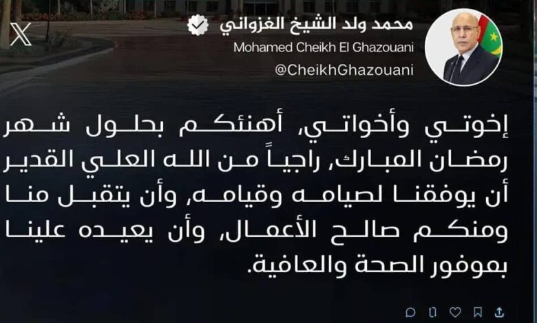 بمناسبة حلول الشهر المبارك رئيس الجمهورية يغرد على منصة X مهنئا الشعب الموريتاني